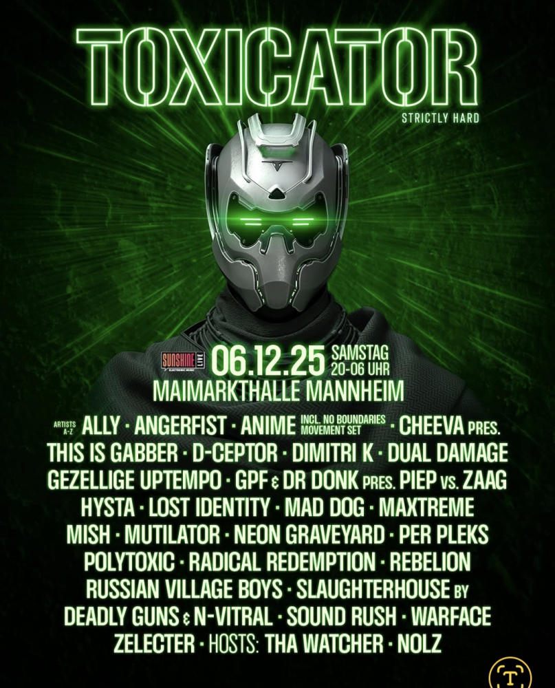 Hardstvle und Hardtechno zur 15. Ausgabe - Am 06. Dezember treten rund 30 internationale DJs auf drei Floors in der Maimarkthalle Mannheim auf,,Strictly Hard" heißt es am 06. Dezember 2025 in der Maimarkthalle in Mannheim bei TOXICATOR. Das größte Festival der ,,Harder Styles" in Süddeutschland hat den TimeTable mit allen Spielzeiten für die drei Areas Hardcore, Hardstyle und Hardtechno bekannt gegeben:
